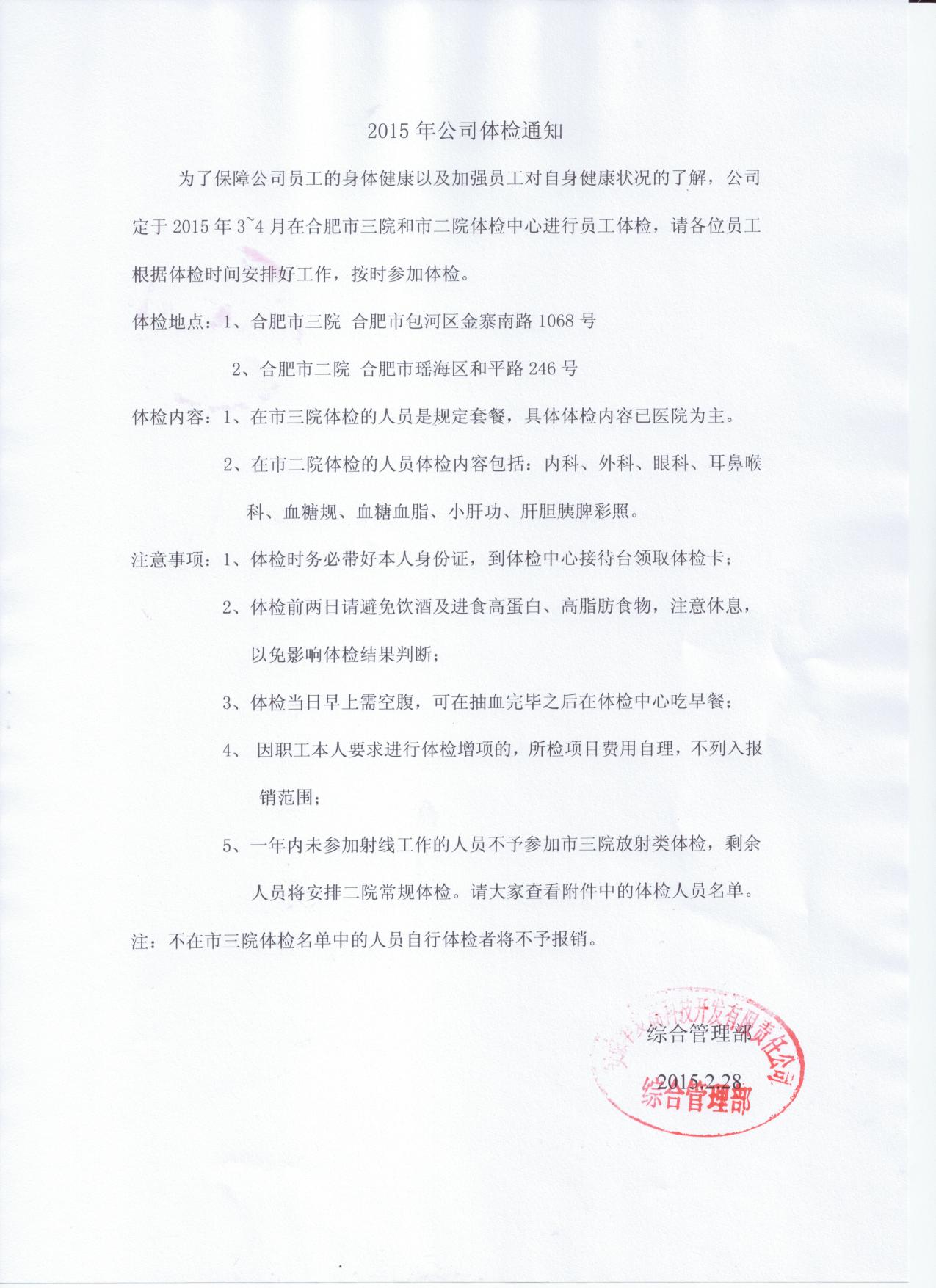 2015年公司員工體檢通知